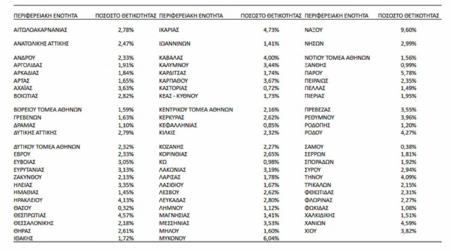 Ο πίνακας με τον δείκτη θετικότητας σε όλες τις περιφέρειες της χώρας