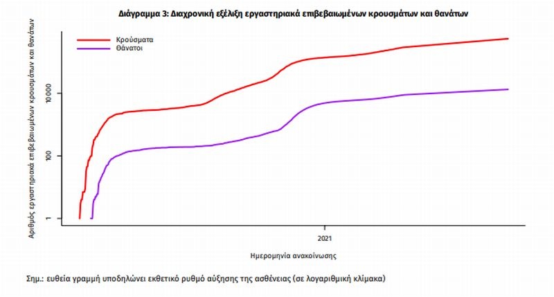 Η διαχρονική εξέλιξη των συνολικών κρουσμάτων και συνολικού αριθμού των θανάτων ασθενών COVID-19 παρουσιάζεται στο ακόλουθο διάγραμμα.