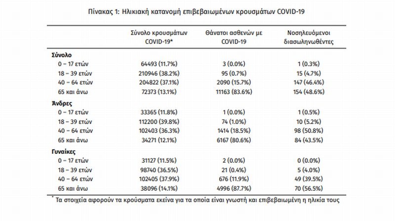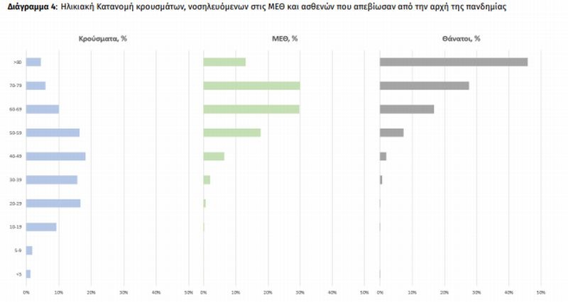 Ο αριθμός των ασθενών που νοσηλεύονται διασωληνωμένοι είναι 317 (60.3% άνδρες). Η διάμεση ηλικία τους είναι 64 έτη. To 83.3% έχει υποκείμενο νόσημα ή/και ηλικία 70 ετών και άνω. Από την αρχή της πανδημίας έχουν εξέλθει από τις ΜΕΘ 2.913 ασθενείς. Οι εισαγωγές νέων ασθενών Covid-19 στα νοσοκομεία της επικράτειας είναι 280 (ημερήσια μεταβολή +4.87%). Ο μέσος όρος εισαγωγών του επταημέρου είναι 252 ασθενείς.Η διάμεση ηλικία των κρουσμάτων είναι 40 έτη (εύρος 0.2 έως 106 έτη), ενώ η διάμεση ηλικία των θανόντων είναι 78 έτη (εύρος 0.2 έως 106 έτη).