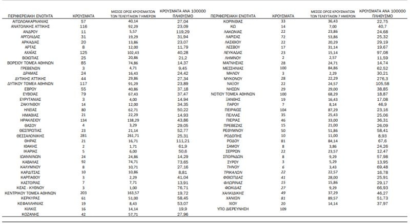 Από το σύνολο των 3.191 νέων κρουσμάτων του νέου ιού στη χώρα 22 είναι εισαγόμενα εκ των οποίων 19 εντοπίστηκαν κατόπιν ελέγχων στις πύλες εισόδου της χώρας . Η κατανομή των 3.169 νέων εγχώριων κρουσμάτων ανά Περιφερειακή Ενότητα παρουσιάζεται στον κατωτέρω πίνακα.