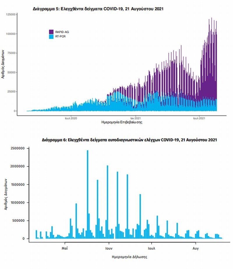 Αυτοδιαγνωστικοί έλεγχοι (Self-tests): Έως 20 Αυγούστου 2021, έχουν καταγραφεί ηλεκτρονικά 32.002.011 δηλώσεις αποτελέσματος αυτοδιαγνωστικού ελέγχου, ενώ 1.074.320 άτομα προσήλθαν για επανέλεγχο.