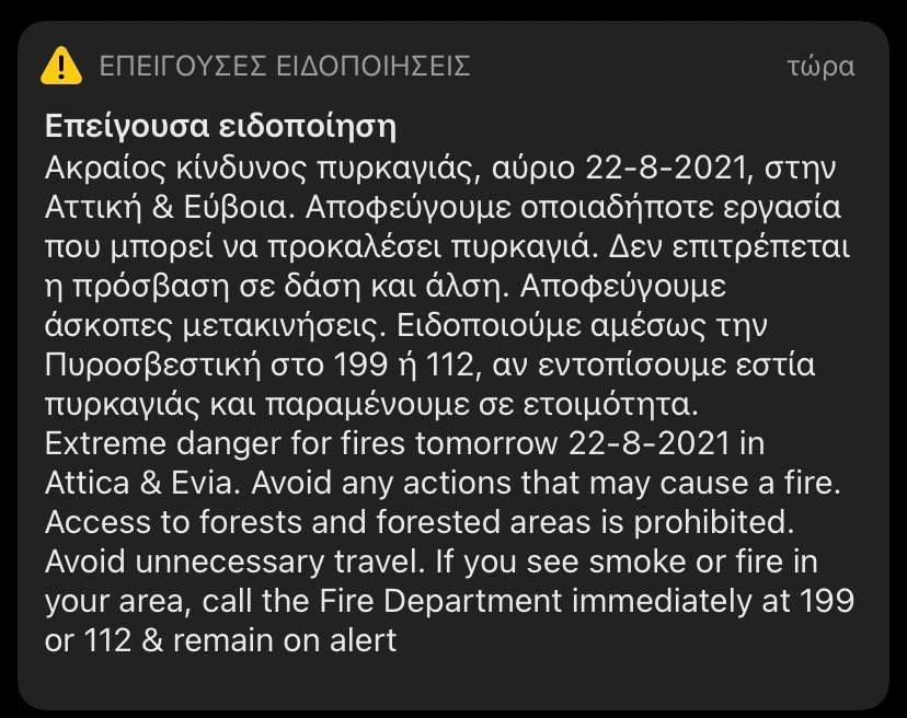 «Αποφεύγουμε οποιαδήποτε εργασία που μπορεί να προκαλέσει πυρκαγιά. Δεν επιτρέπεται η πρόσβαση σε δάση και άλση. Αποφεύγουμε άσκοπες μετακινήσεις. Ειδοποιούμε αμέσως την Πυροσβεστική στο 199 ή 112 αν εντοπίσουμε εστία πυρκαγιάς και παραμένουμε σε ετοιμότητα», ανέφερε το μήνυμα που ήρθε στα κινητά λίγο μετά τις 14:15.