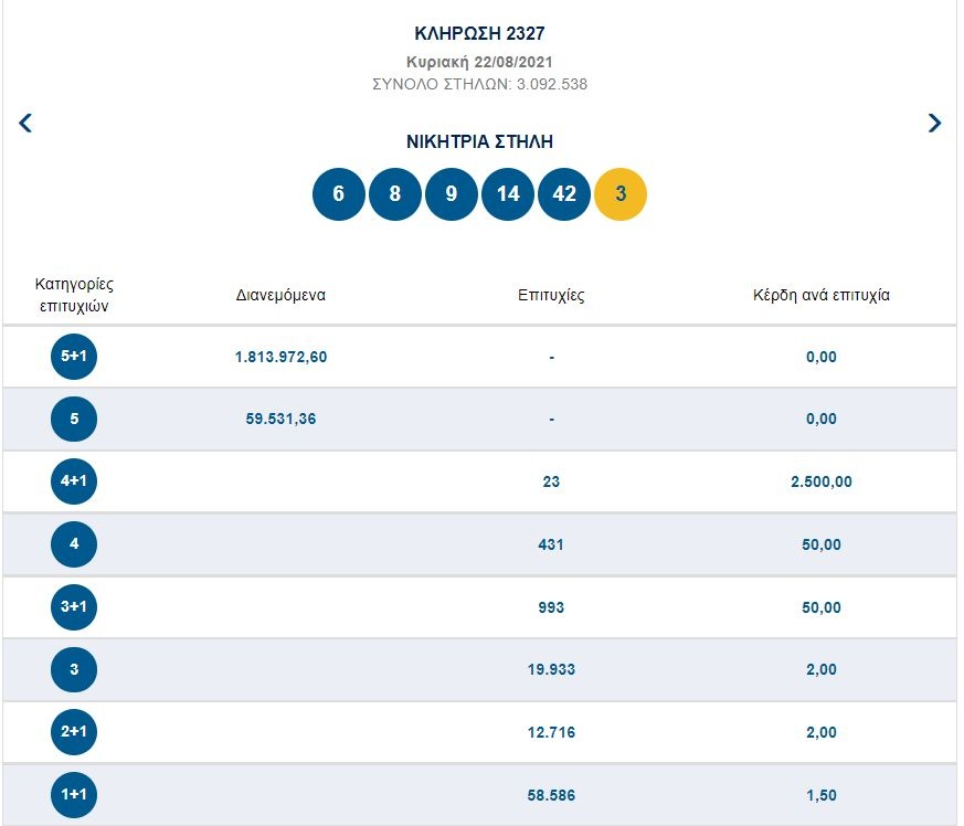 Οι τυχεροί αριθμοί που κληρώθηκαν είναι οι: 6, 8, 9, 14, 42 και Τζόκερ ο αριθμός 3.