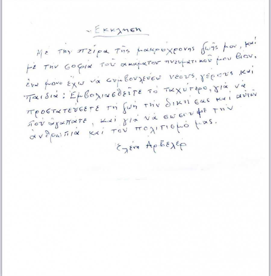 «Με την πείρα της μακρόχρονης ζωής μου, και με τη σοφία του ακάματου πνευματικού μου βίου, ένα μόνο έχω να συμβουλεύσω νέους, γέρους και παιδιά: Εμβολιαστείτε το ταχύτερο, για να προστατεύσετε τη ζωή την δική σας και αυτών που αγαπάτε, και για να σώσουμε την ανθρωπιά και τον πολιτισμό μας. Ελένη Αρβελέρ».