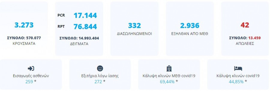 Κρούσματα σήμερα: 3.273 νέα ανακοίνωσε ο ΕΟΔΥ - 42 νεκροί σε 24 ώρες, στους 332 οι διασωληνωμένοι