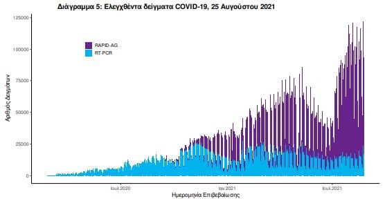 Στις 24 Αυγούστου 2021, πραγματοποιήθηκαν 140 δράσεις δειγματοληπτικών ελέγχων από τις Κινητές Ομάδες Υγείας (ΚΟΜΥ) του ΕΟΔΥ, στις οποίες διενεργήθηκαν 30.748 έλεγχοι Rapid Ag και ανευρέθηκαν 711 θετικά (2,31%).