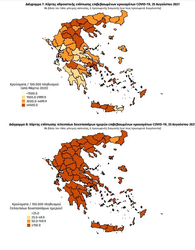 Ημερήσιος αριθμός και κρούσματα ανά 100.000 πληθυσμού επιβεβαιωμένων εγχώριων κρουσμάτων COVID-19 ανά περιφερειακή ενότητα στις 25 Αυγούστου 2021