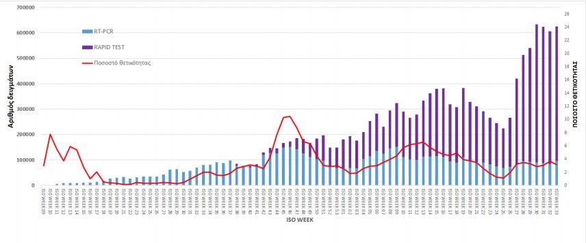 Ποσοστό θετικότητας ανά ISO WEEK με βάση το σύνολο των ελεγχθέντων δειγμάτων COVID-19