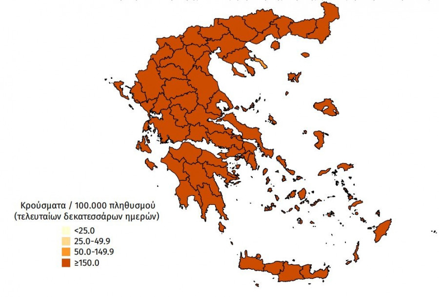 Γεωγραφική διασπορά: Ο χάρτης αποτυπώνει τη γεωγραφική κατανομή των συνολικών κρουσμάτων COVID-19 (από την αρχή της επιδημίας) ανά Περιφερειακή Ενότητα της χώρας, με βάση την δηλωθείσα διεύθυνση μόνιμης κατοικίας του ασθενούς, ή τη διεύθυνση προσωρινής διαμονής για τους τουρίστες και άλλους προσωρινά διαμένοντες στην Ελλάδα. Συμπεριλαμβάνονται τόσο κρούσματα με ιστορικό ταξιδίου (“εισαγόμενα”) όσο και κρούσματα με πιθανή εγχώρια μετάδοση.