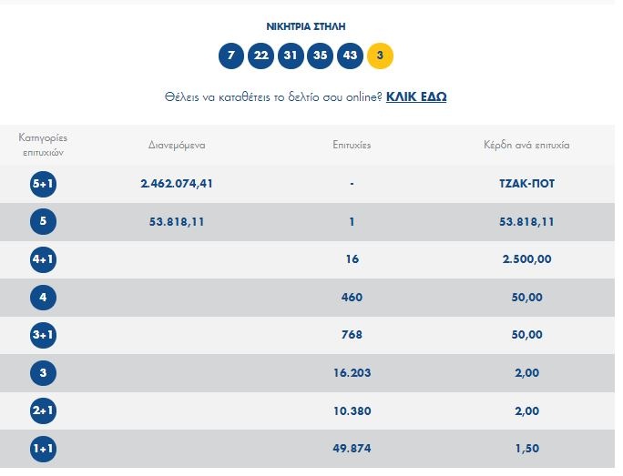 Οι τυχεροί αριθμοί που κληρώθηκαν είναι οι: 7, 22, 31, 35, 43 και Τζόκερ ο αριθμός 3.