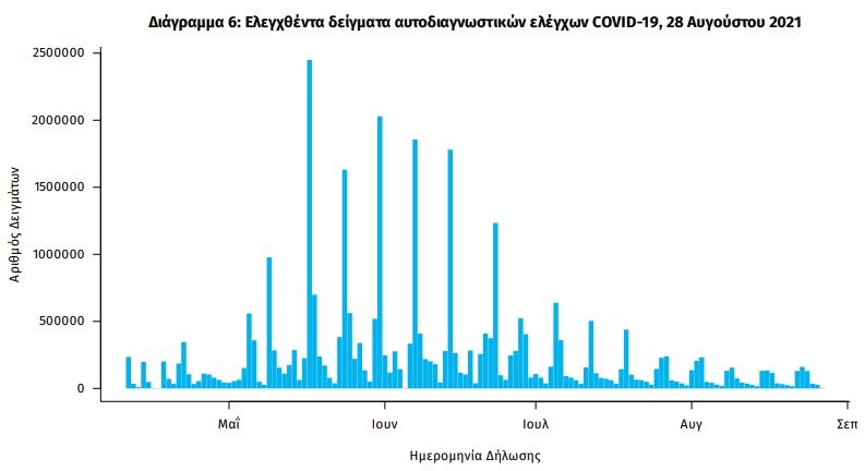 Έως 27 Αυγούστου 2021, έχουν καταγραφεί ηλεκτρονικά 32.526.983 δηλώσεις αποτελέσματος αυτοδιαγνωστικού ελέγχου, ενώ 1.111.696 άτομα προσήλθαν για επανέλεγχο.