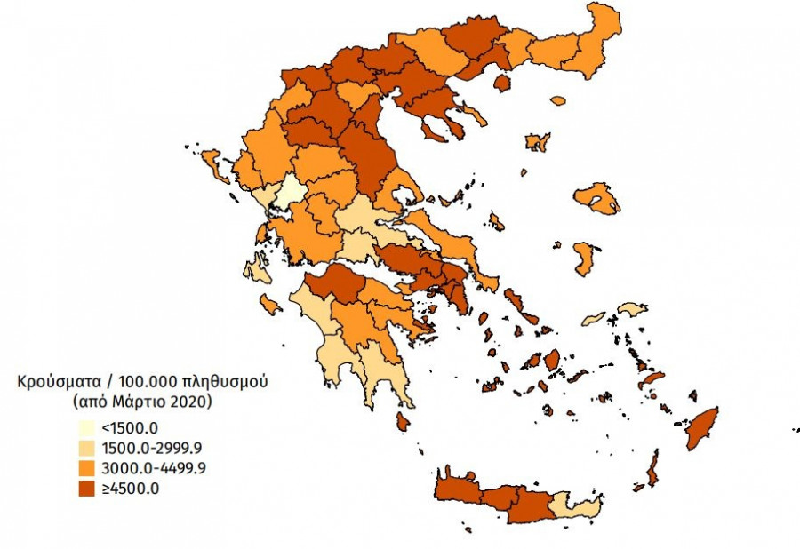Γεωγραφική διασπορά: Ο χάρτης αποτυπώνει τη γεωγραφική κατανομή των συνολικών κρουσμάτων COVID-19 (από την αρχή της επιδημίας) ανά Περιφερειακή Ενότητα της χώρας, με βάση την δηλωθείσα διεύθυνση μόνιμης κατοικίας του ασθενούς, ή τη διεύθυνση προσωρινής διαμονής για τους τουρίστες και άλλους προσωρινά διαμένοντες στην Ελλάδα. Συμπεριλαμβάνονται τόσο κρούσματα με ιστορικό ταξιδίου (“εισαγόμενα”) όσο και κρούσματα με πιθανή εγχώρια μετάδοση.