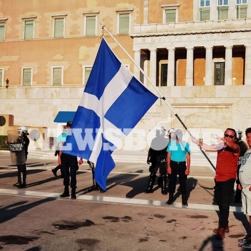 Πολλοί συγκεντρωμένοι κρατάνε ελληνικές σημαίες, ενώ όπως αναφέρουν οι ίδιοι, διοργανωτής είναι ο «Ελληνικός λαός».