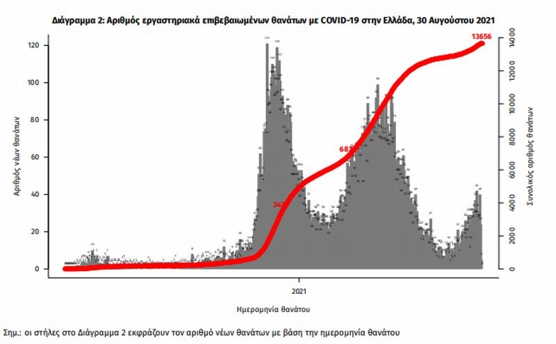 Οι νέοι θάνατοι ασθενών με COVID-19 είναι 19, ενώ από την έναρξη της επιδημίας έχουν καταγραφεί συνολικά 13.656 θάνατοι. Το 95.3% είχε υποκείμενο νόσημα ή/και ηλικία 70 ετών και άνω.