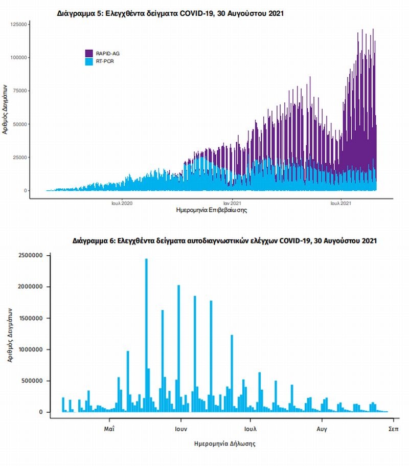 Αυτοδιαγνωστικοί έλεγχοι (Self-tests): Έως 29 Αυγούστου 2021, έχουν καταγραφεί ηλεκτρονικά 32.575.893 δηλώσεις αποτελέσματος αυτοδιαγνωστικού ελέγχου, ενώ 1.114.570 άτομα προσήλθαν για επανέλεγχο.
