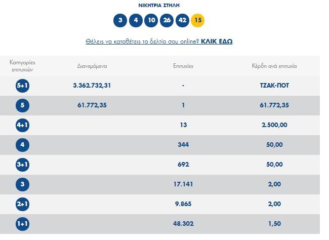 Οι τυχεροί αριθμοί που κληρώθηκαν είναι οι: 3, 4, 10, 26, 42, με τζόκερ τον αριθμό 15.