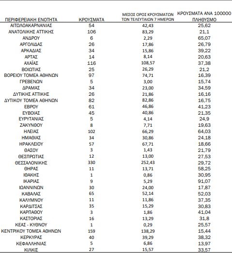 Η κατανομή των 2.852 νέων εγχώριων κρουσμάτων ανά Περιφερειακή Ενότητα παρουσιάζεται στον κατωτέρω πίνακα