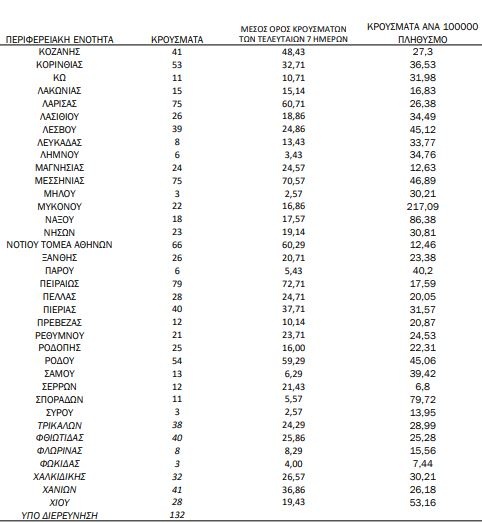 Τα κρούσματα ανά Περιφερειακή Ενότητα: