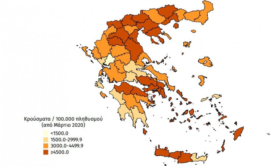 Γεωγραφική διασπορά: Ο χάρτης αποτυπώνει τη γεωγραφική κατανομή των συνολικών κρουσμάτων COVID-19 (από την αρχή της επιδημίας) ανά Περιφερειακή Ενότητα της χώρας, με βάση την δηλωθείσα διεύθυνση μόνιμης κατοικίας του ασθενούς, ή τη διεύθυνση προσωρινής διαμονής για τους τουρίστες και άλλους προσωρινά διαμένοντες στην Ελλάδα. Συμπεριλαμβάνονται τόσο κρούσματα με ιστορικό ταξιδίου (“εισαγόμενα”) όσο και κρούσματα με πιθανή εγχώρια μετάδοση.