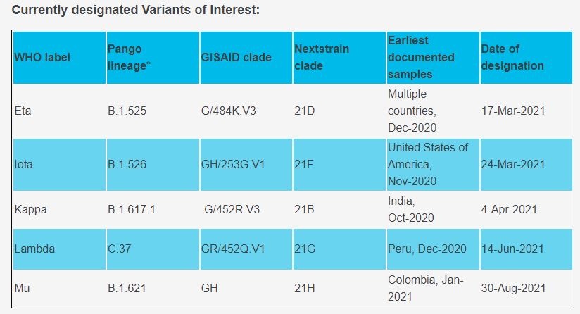 Υπενθυμίζεται ότι πριν λίγα 24ωρα, ο Παγκόσμιος Οργανισμός Υγείας ενέταξε μια νέα παραλλαγή/ μετάλλαξη του κορονοϊού που προκαλεί την Covid-19 στη λίστα των παραλλαγών ενδιαφέροντος (Variants of Interest): Πρόκειται για τη μετάλλαξη «Μι» (Μu).