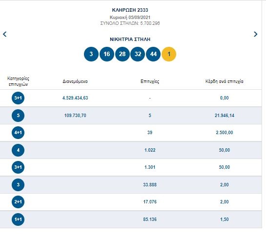 Οι τυχεροί αριθμοί που κληρώθηκαν είναι οι: 3, 16, 28, 32, 44 και τζόκερ ο αριθμός 1.