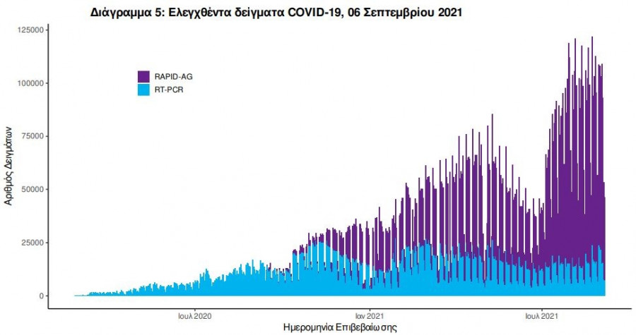 Στις 05 Σεπτεμβρίου 2021, πραγματοποιήθηκαν 36 δράσεις δειγματοληπτικών ελέγχων από τις Κινητές Ομάδες Υγείας (ΚΟΜΥ) του ΕΟΔΥ, στις οποίες διενεργήθηκαν 11.009 έλεγχοι Rapid Ag και ανευρέθηκαν 253 θετικά (2,3%).