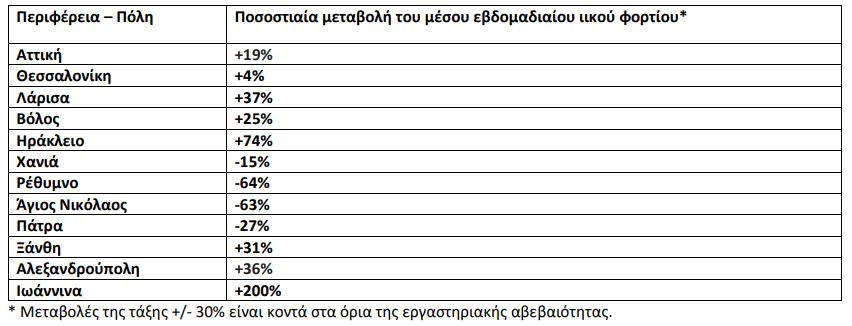 Καθαρά αυξητικές τάσεις παρατηρήθηκαν στην Ξάνθη (+31%), στην Αλεξανδρούπολη (+36%), στη Λάρισα (+37%), στο Ηράκλειο (+74%) και στα