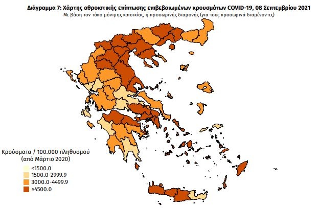 Ημερήσιος αριθμός και κρούσματα ανά 100.000 πληθυσμού επιβεβαιωμένων εγχώριων κρουσμάτων COVID-19 ανά περιφερειακή ενότητα στις 08 Σεπτεμβρίου 2021.