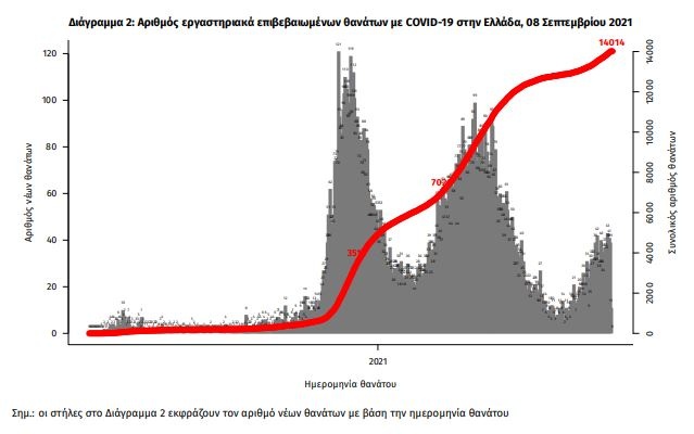 Οι νέοι θάνατοι ασθενών με COVID-19 είναι 37, ενώ από την έναρξη της επιδημίας έχουν καταγραφεί συνολικά 14.014 θάνατοι. Το 95.4% είχε υποκείμενο νόσημα ή/και ηλικία 70 ετών και άνω.