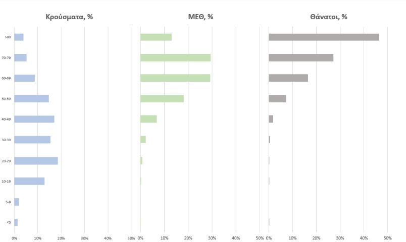 Ακολούθως παρουσιάζεται η ηλικιακή κατανομή των (α) συνολικών κρουσμάτων, (β) των περιστατικών που κατέληξαν σε θάνατο και (γ) των ασθενών που νοσηλεύονται διασωληνωμένοι: