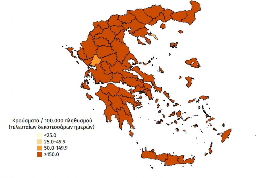 Γεωγραφική διασπορά: Ο χάρτης αποτυπώνει τη γεωγραφική κατανομή των συνολικών κρουσμάτων COVID-19 (από την αρχή της επιδημίας) ανά Περιφερειακή Ενότητα της χώρας, με βάση την δηλωθείσα διεύθυνση μόνιμης κατοικίας του ασθενούς, ή τη διεύθυνση προσωρινής διαμονής για τους τουρίστες και άλλους προσωρινά διαμένοντες στην Ελλάδα. Συμπεριλαμβάνονται τόσο κρούσματα με ιστορικό ταξιδίου (“εισαγόμενα”) όσο και κρούσματα με πιθανή εγχώρια μετάδοση.