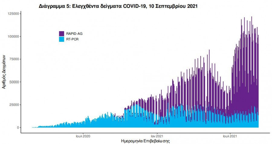 Στις 09 Σεπτεμβρίου 2021, πραγματοποιήθηκαν 153 δράσεις δειγματοληπτικών ελέγχων από τις Κινητές Ομάδες Υγείας (ΚΟΜΥ) του ΕΟΔΥ, στις οποίες διενεργήθηκαν 31.440 έλεγχοι Rapid Ag και ανευρέθηκαν 422 θετικά (1,34%).