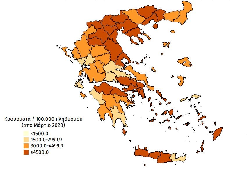 Γεωγραφική διασπορά: Ο χάρτης αποτυπώνει τη γεωγραφική κατανομή των συνολικών κρουσμάτων COVID-19 (από την αρχή της επιδημίας) ανά