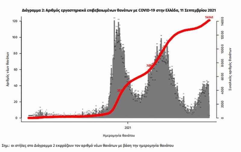 Οι νέοι θάνατοι ασθενών με COVID-19 είναι 39, ενώ από την έναρξη της επιδημίας έχουν καταγραφεί συνολικά 14.141 θάνατοι. Το 95.4% είχε υποκείμενο νόσημα ή/και ηλικία 70 ετών και άνω.