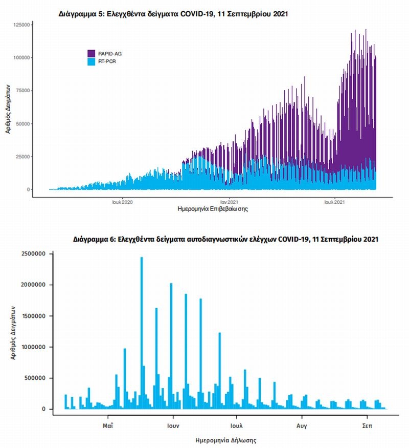 Αυτοδιαγνωστικοί έλεγχοι (Self-tests): Έως 10 Σεπτεμβρίου 2021, έχουν καταγραφεί ηλεκτρονικά 33.534.265 δηλώσεις αποτελέσματος αυτοδιαγνωστικού ελέγχου, ενώ 1.202.874 άτομα προσήλθαν για επανέλεγχο.