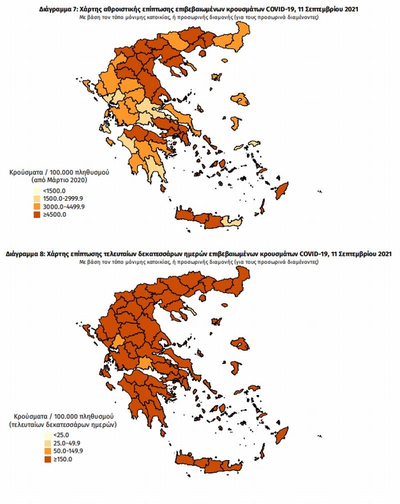 Πίνακας 2: Ημερήσιος αριθμός και κρούσματα ανά 100.000 πληθυσμού επιβεβαιωμένων εγχώριων κρουσμάτων COVID-19 ανά περιφερειακή ενότητα στις 11 Σεπτεμβρίου 2021