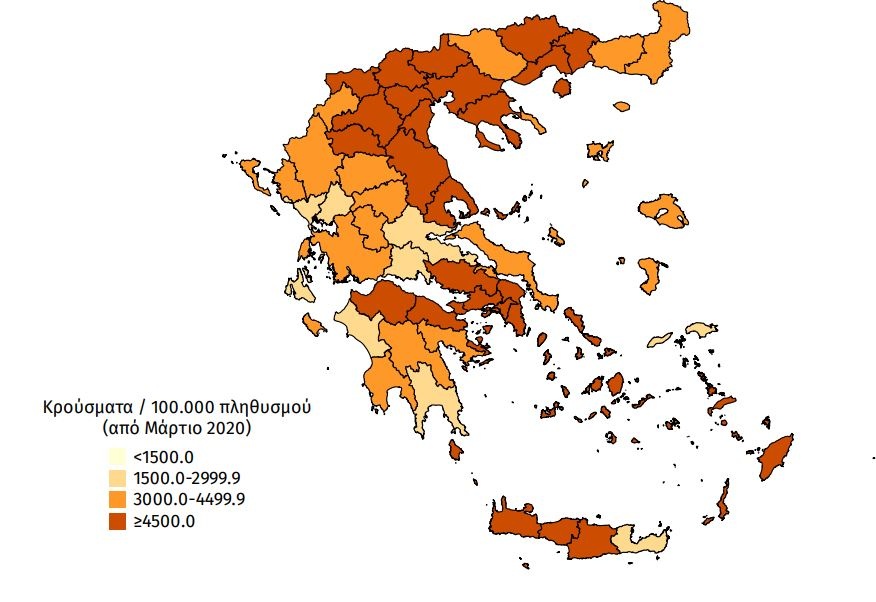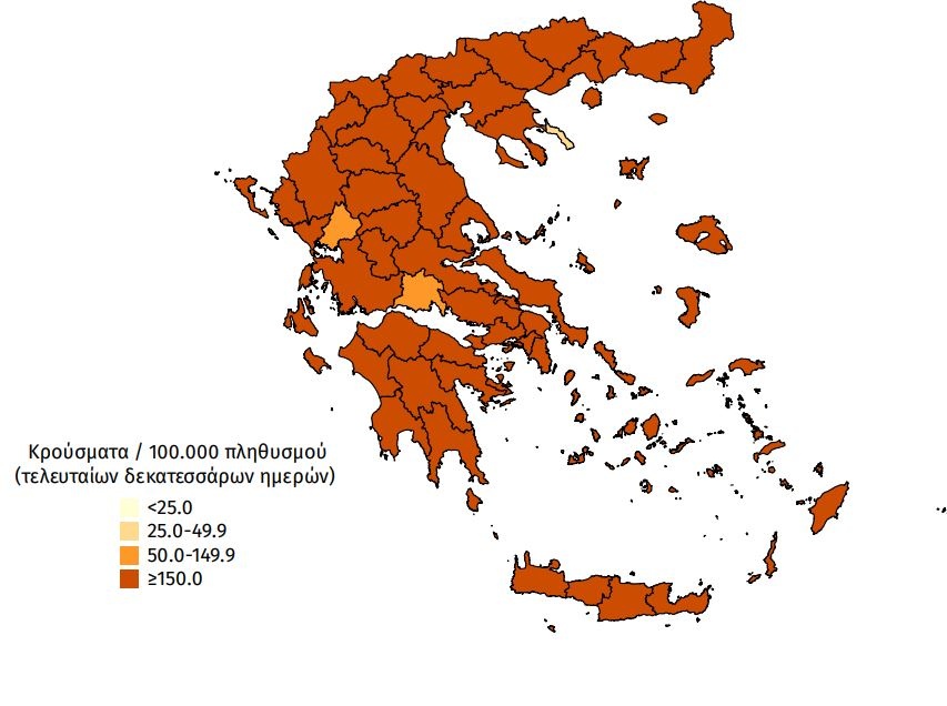 Γεωγραφική διασπορά: Ο χάρτης αποτυπώνει τη γεωγραφική κατανομή των συνολικών κρουσμάτων COVID-19 (από την αρχή της επιδημίας) ανά Περιφερειακή Ενότητα της χώρας, με βάση την δηλωθείσα διεύθυνση μόνιμης κατοικίας του ασθενούς, ή τη διεύθυνση προσωρινής διαμονής για τους τουρίστες και άλλους προσωρινά διαμένοντες στην Ελλάδα. Συμπεριλαμβάνονται τόσο κρούσματα με ιστορικό ταξιδίου (“εισαγόμενα”) όσο και κρούσματα με πιθανή εγχώρια μετάδοση.