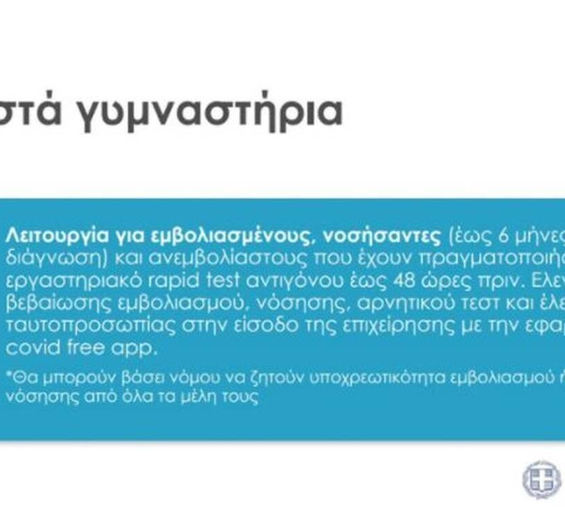 - Τα γήπεδα (κλειστά και ανοιχτά) θα λειτουργούν μόνο για εμβολιασμένους και νοσήσαντες (έως 6 μήνες από τη νόσηση).