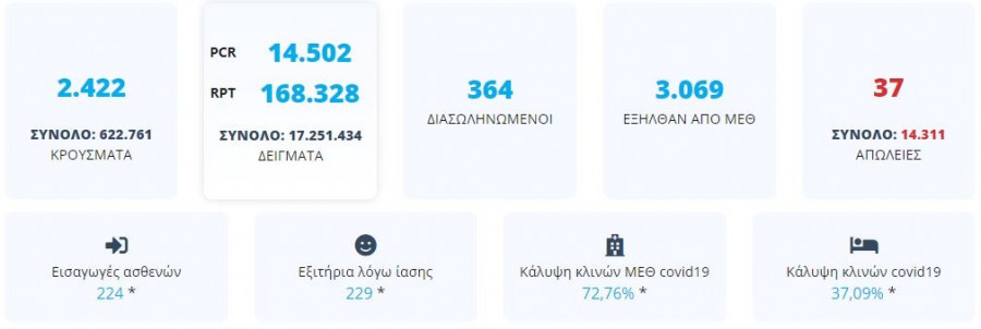 Οι νέοι θάνατοι ασθενών με COVID-19 είναι 37, ενώ από την έναρξη της επιδημίας έχουν καταγραφεί συνολικά 14.311 θάνατοι.