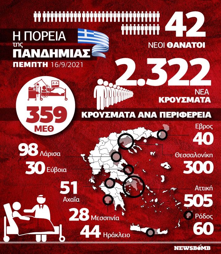 Οι νέοι θάνατοι ασθενών με COVID-19 είναι 42, ενώ ο αριθμός των ασθενών που νοσηλεύονται διασωληνωμένοι είναι 359.