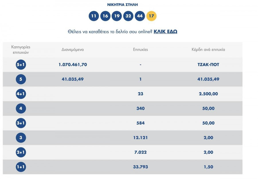 Οι τυχεροί αριθμοί που κληρώθηκαν είναι οι: 11, 16, 19, 32, 44 και Τζόκερ ο αριθμός 17.