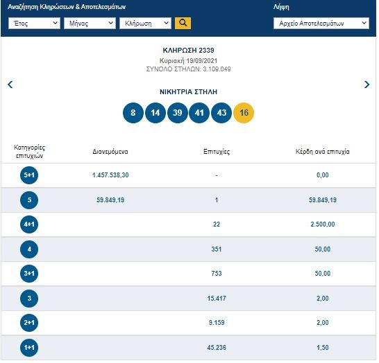 Οι τυχεροί αριθμοί που κληρώθηκαν την Κυριακή είναι οι: 8, 14, 39, 41, 43 και Τζόκερ ο αριθμός 16.
