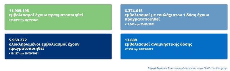 Μέχρι σήμερα (20.09), στην Ελλάδα έχουν πραγματοποιηθεί 11.909.198 εμβολιασμοί. Από αυτούς, οι 6.374.615 αφορούσαν τη χορήγηση πρώτης δόσης, ενώ οι 5.959.272 χορήγηση δεύτερης δόσης και του μονοδοσικού εμβολίου. Στα δεδομένα έχουν προστεθεί πλέον και οι τρίτες δόσεις που χορηγούνται στους πολίτες, οι οποίες έχουν φτάσει στις 13.888.
