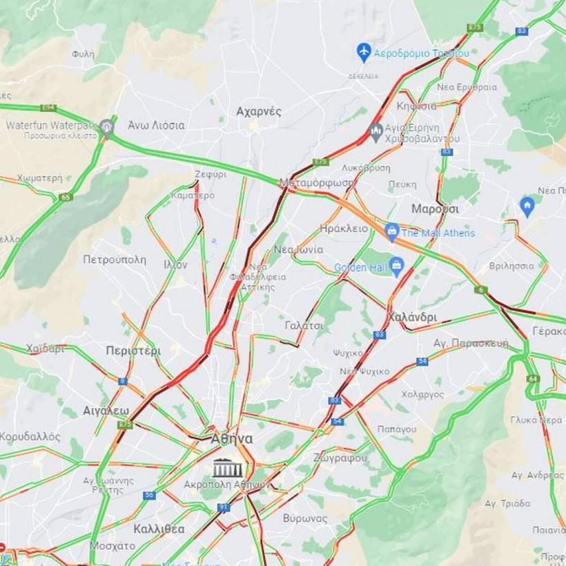 Είναι ενδεικτικό ότι στον χάρτη της Google που αποτυπώνει την κατάσταση της κίνησης τα αυτοκίνητα στην κάθοδο του Κηφισού εμφανίζονται να κινούνται σε ρυθμούς σημειωτόν από το ύψος του Τατοΐου μέχρι και το ύψος της Πέτρου Ράλλη.