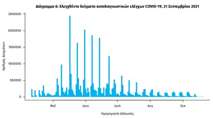 Έως 20 Σεπτεμβρίου 2021, έχουν καταγραφεί ηλεκτρονικά 33.730.805 δηλώσεις αποτελέσματος αυτοδιαγνωστικού ελέγχου, ενώ 1.695.802 άτομα προσήλθαν για επανέλεγχο.