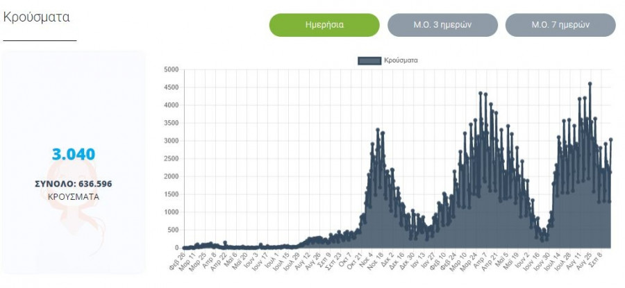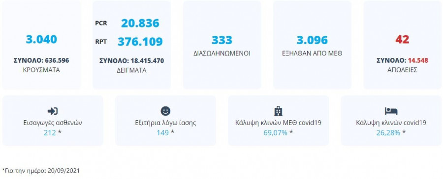Με βάση τα δεδομένα που έχουν δηλωθεί στον ΕΟΔΥ και καταγραφεί μέχρι τις 21 Σεπτεμβρίου 2021 (ώρα 15:00), τα νέα εργαστηριακά επιβεβαιωμένα κρούσματα της νόσου που καταγράφηκαν τις τελευταίες 24 ώρες είναι 3.040, εκ των οποίων 8 εντοπίστηκαν κατόπιν ελέγχων στις πύλες εισόδου της χώρας. Ο συνολικός αριθμός των κρουσμάτων ανέρχεται σε 636.596 (ημερήσια μεταβολή +0.6%), εκ των οποίων 51.0% άνδρες.