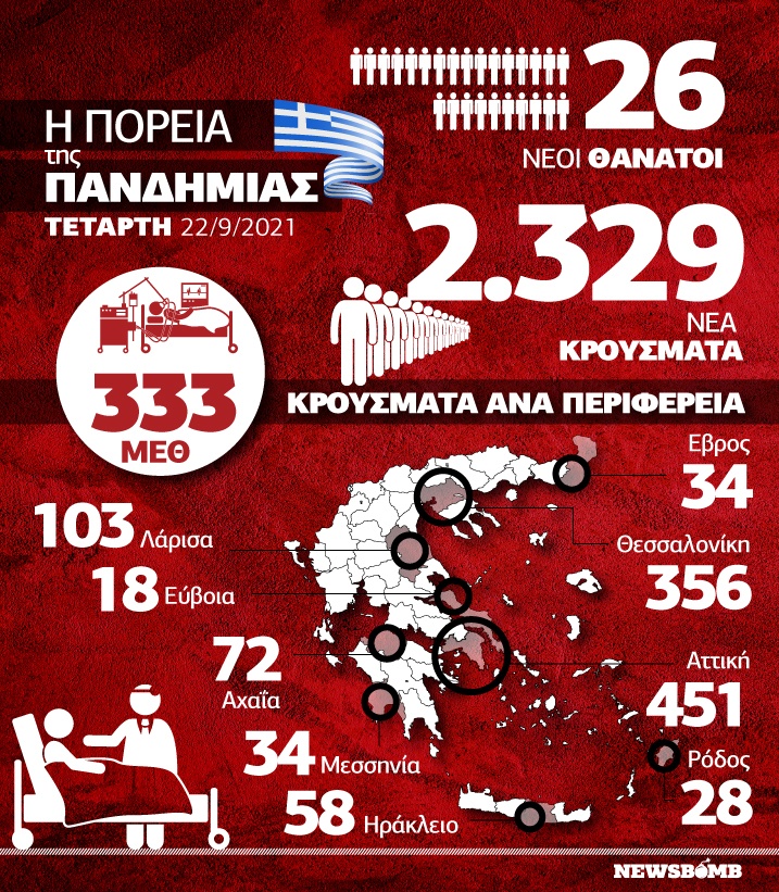 Πιο συγκεκριμένα, τα νέα εργαστηριακά επιβεβαιωμένα κρούσματα της νόσου που καταγράφηκαν τις τελευταίες 24 ώρες είναι 2.329.