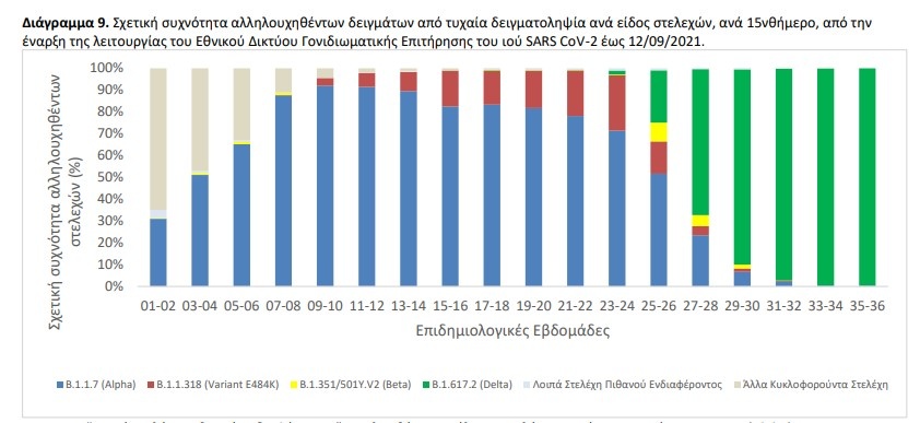Η διαχρονική εξέλιξη της σχετικής συχνότητας των αλληλουχηθέντων δειγμάτων από τυχαία δειγματοληψία ανά είδος στελεχών, μέχρι και την εβδομάδα 36.