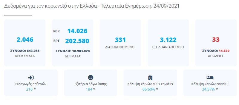 Τα στοιχεία που παρουσιάζονται αφορούν περιστατικά από την επιδημιολογική επιτήρηση της νόσου από το νέο κορωνοϊό (COVID19), με βάση τα δεδομένα που έχουν δηλωθεί στον ΕΟΔΥ και καταγραφεί μέχρι τις 24 Σεπτεμβρίου 2021 (ώρα 15:00).