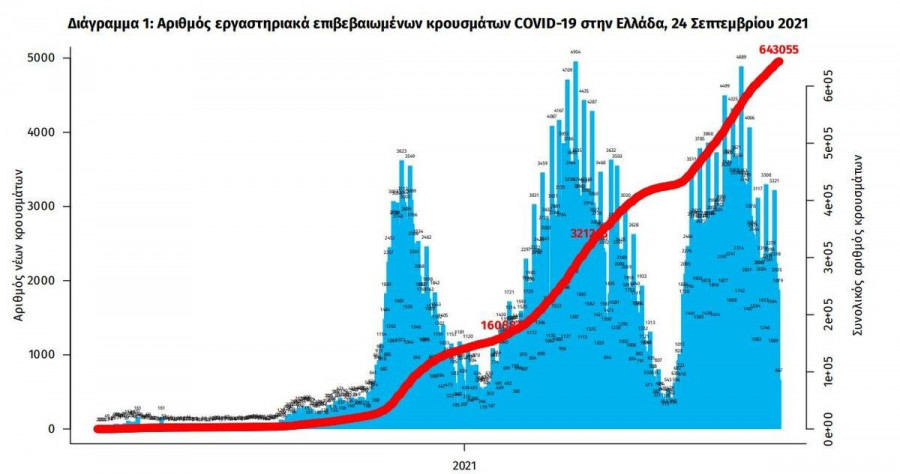 Οι νέοι θάνατοι ασθενών με COVID-19 είναι 33, ενώ από την έναρξη της επιδημίας έχουν καταγραφεί συνολικά 14.639 θάνατοι. Το 95.4% είχε υποκείμενο νόσημα ή/και ηλικία 70 ετών και άνω.